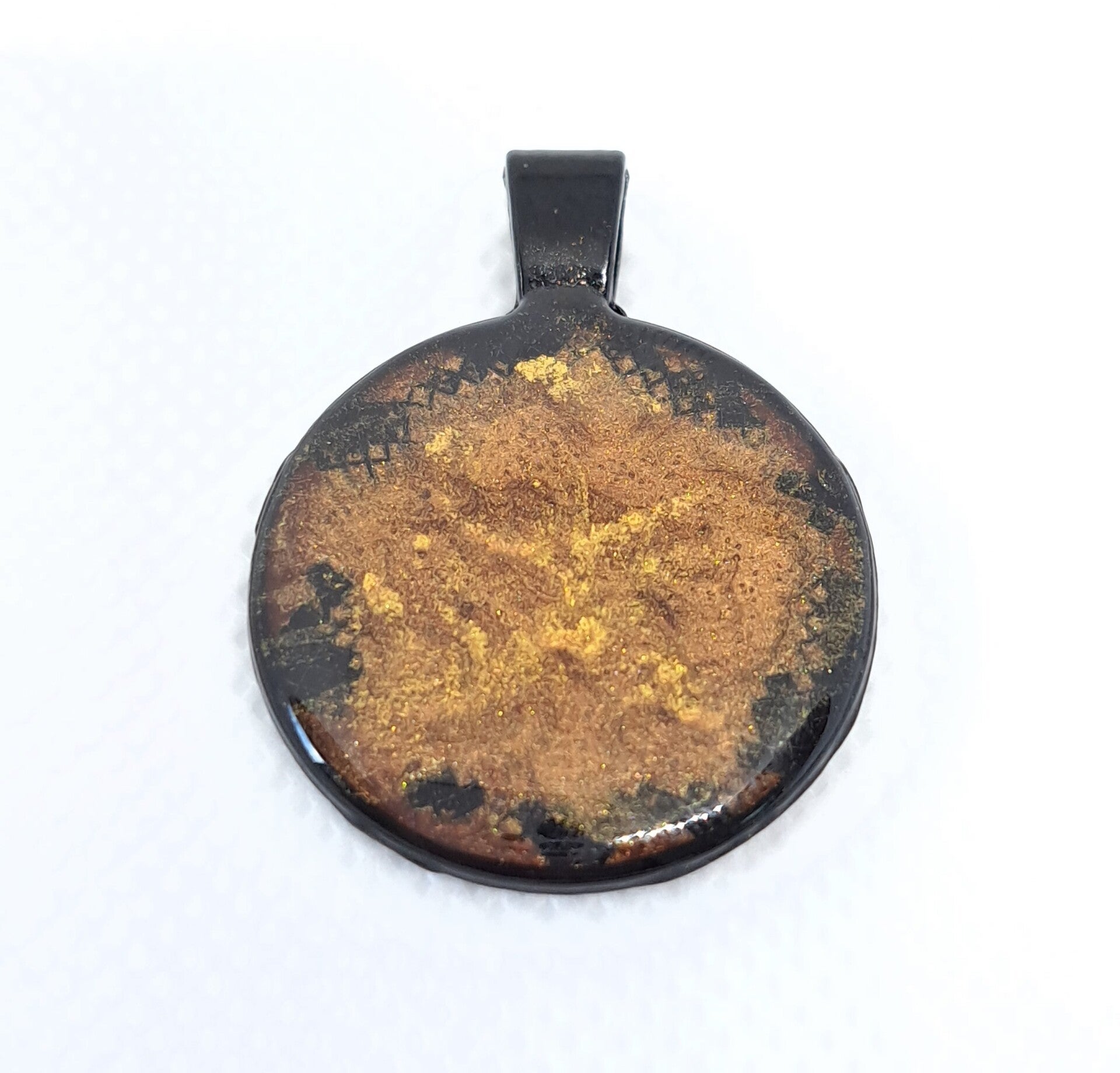 Handgemaakte hanger met warme goudbruine gloed en organische textuur. Uniek, karaktervol en subtiel opvallend.