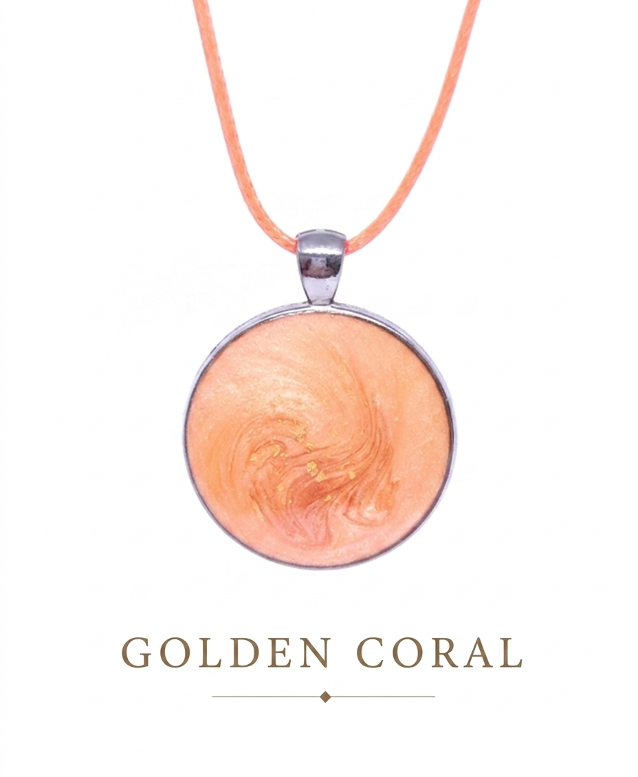 Laat je betoveren door de warme gloed van de "Golden Coral" hanger, een sieraad dat de essentie van een rustige zonsondergang aan de kust in een tijdloos ontwerp vangt. Dit unieke kunstwerkje is met zorg handgemaakt en combineert zachte, koraalkleurige tinten met de luxueuze schittering van echte bladgoudaccenten die als vloeibaar licht door de hars dansen. Omdat elke hanger met de hand wordt gegoten, vormt zich telkens een organisch, wervelend patroon dat volledig uniek is voor jouw exemplaar, waardoor je altijd een exclusief stuk draagt.